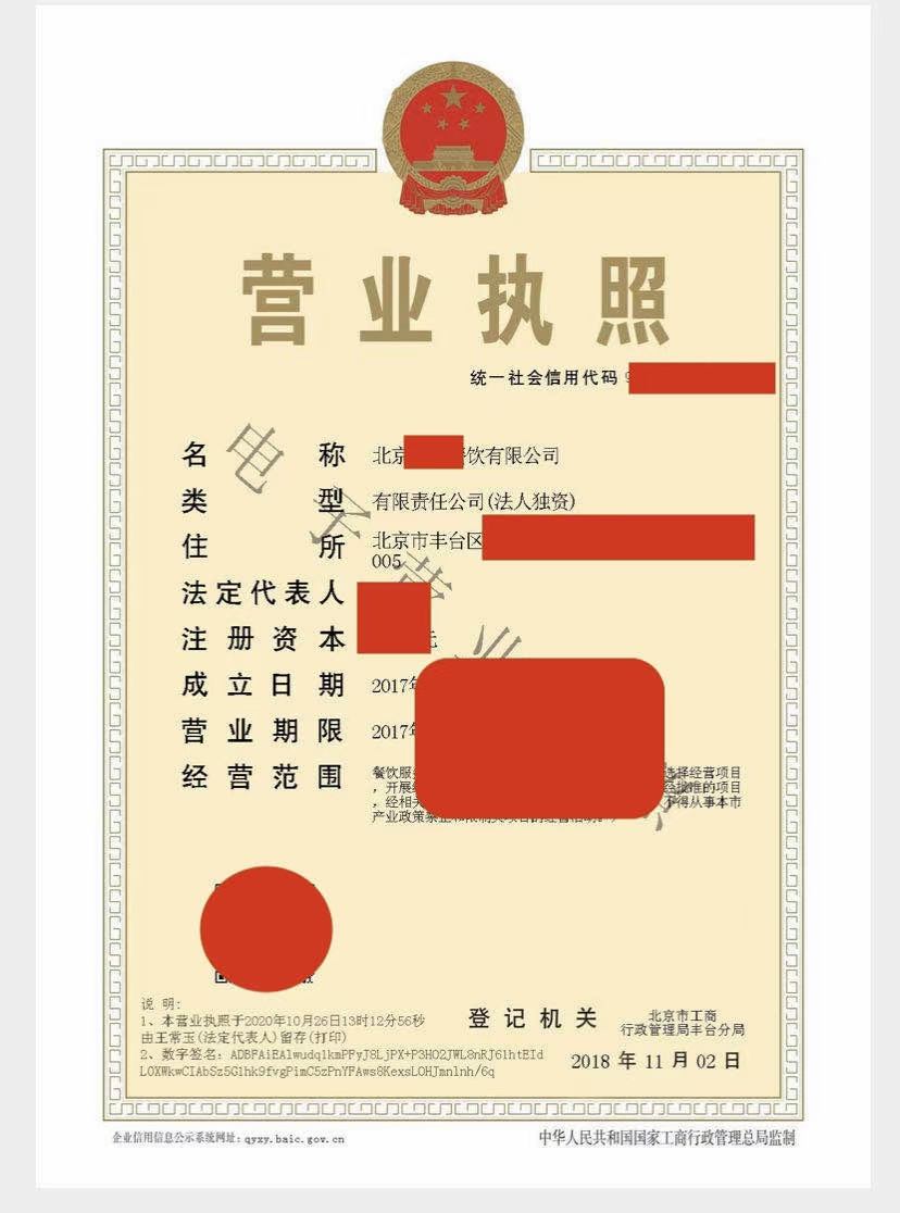 公司名稱:北京餐飲有限公司轉讓(法人獨資公司)